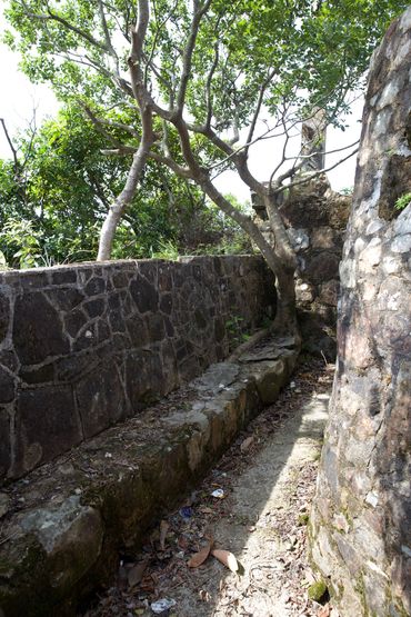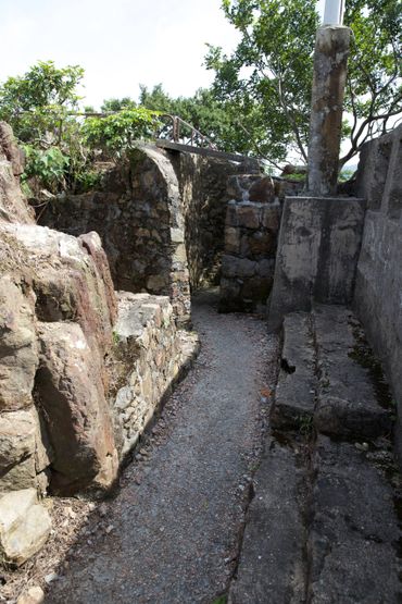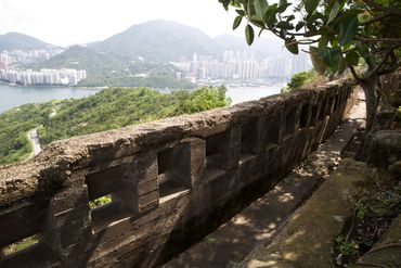 When the New Territories were leased to Britain in 1898, the British military chose Devil’s Peak on the northern side of Lyemun Strait as a site for a defensive position. In 1914-1915, two batteries were constructed there with four gun emplacements. The peak was selected as the site for the headquarters of Eastern Fire Command, and a redoubt was subsequently constructed. The battery on the upper level, named Gough Battery, was equipped with a 6 inch gun. The battery at the lower level was called Pottinger Battery and its armament comprised two 9.2 inch guns.