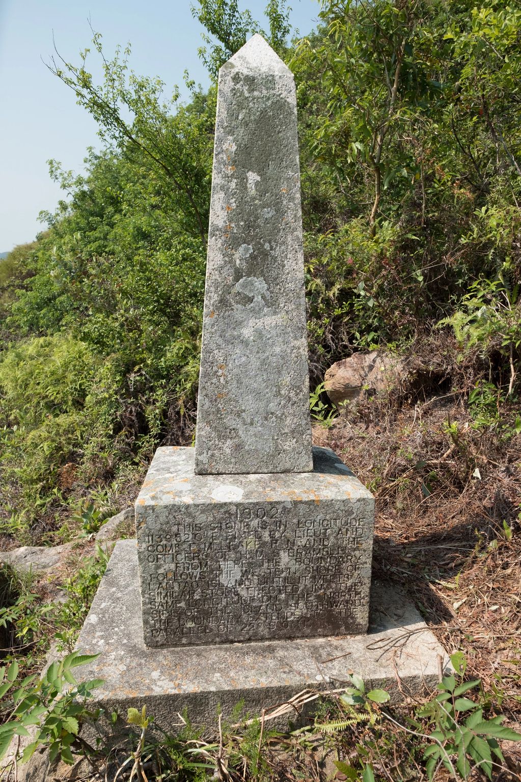 THIS STONE IS IN LONGITUDE 113°52’0” E. FIXED BY LIEUT AND COMR F. M. LEAKE R. N. AND THE OFFICERS OF H. M. S “BRAMBLE”FROM HERE THE BOUNDARY FOLLOWS THE WESTERN SHORE OF LANTAU ISLAND UNTIL IT MEETS A SIMILAR STONE ERECTED IN THE SAME LONGITUDE ON THE NORTH SIDE OF THE ISLAND SOUTHWARD. THE BOUNDARY EXTENDS TO THE PARALLEL OF 22°9’0” N.