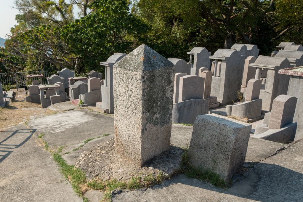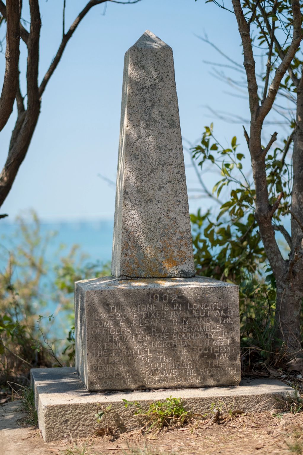 Two small obelisks fixed in 1902 at longitude 113°52’0” E to state the north and south boundaries of Lantau by Liet. and Comr. F.M. Leake R.N. and the officers of H. M. S “Bramble”.